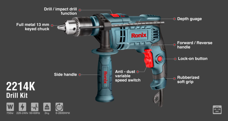 وزن دریل چکشی 2214K متناسب با نوع کاربری و اندازهی آن طراحی شده است. همچنین، بدنه ارگونومیک همراه با دسته جانبی ضد لرزش 360 درجه، باعث شده تا بتوانید دریل را در مدتزمان طولانیتری در دست بگیرید و کارتان را راحتتر انجام دهید. همچنین، این محصول در یک کیف BMC مقاوم به ضربه بستهبندی شده و به بازار ابزار ایران ارائه میشود.